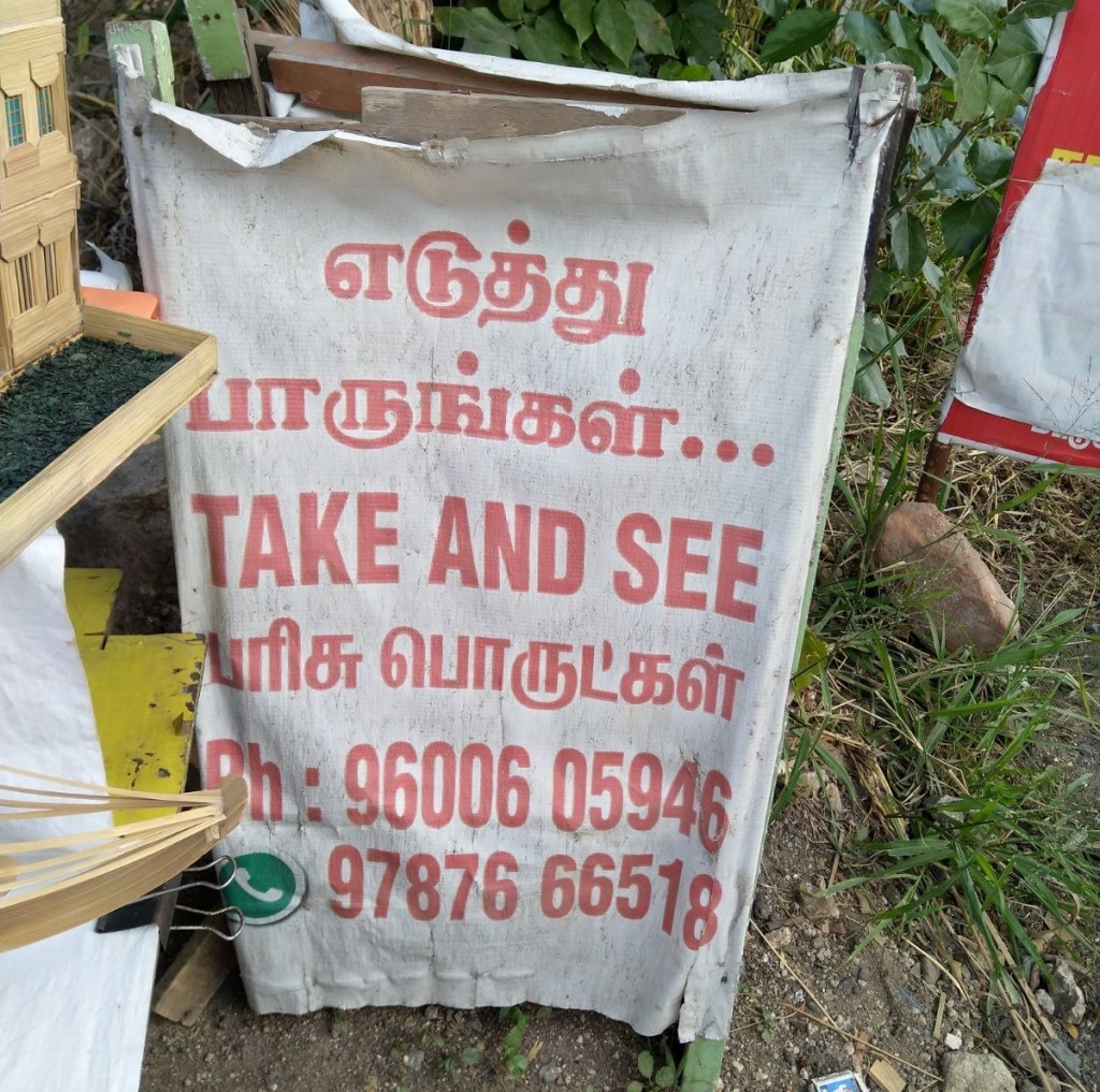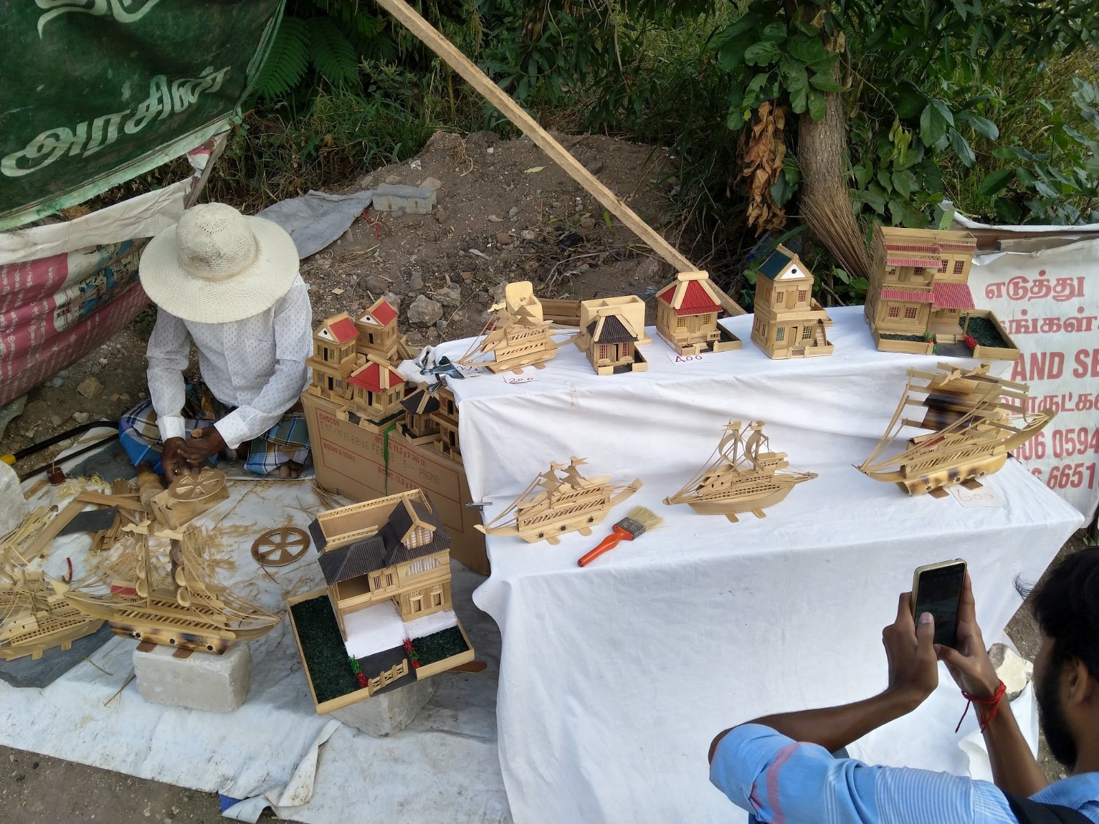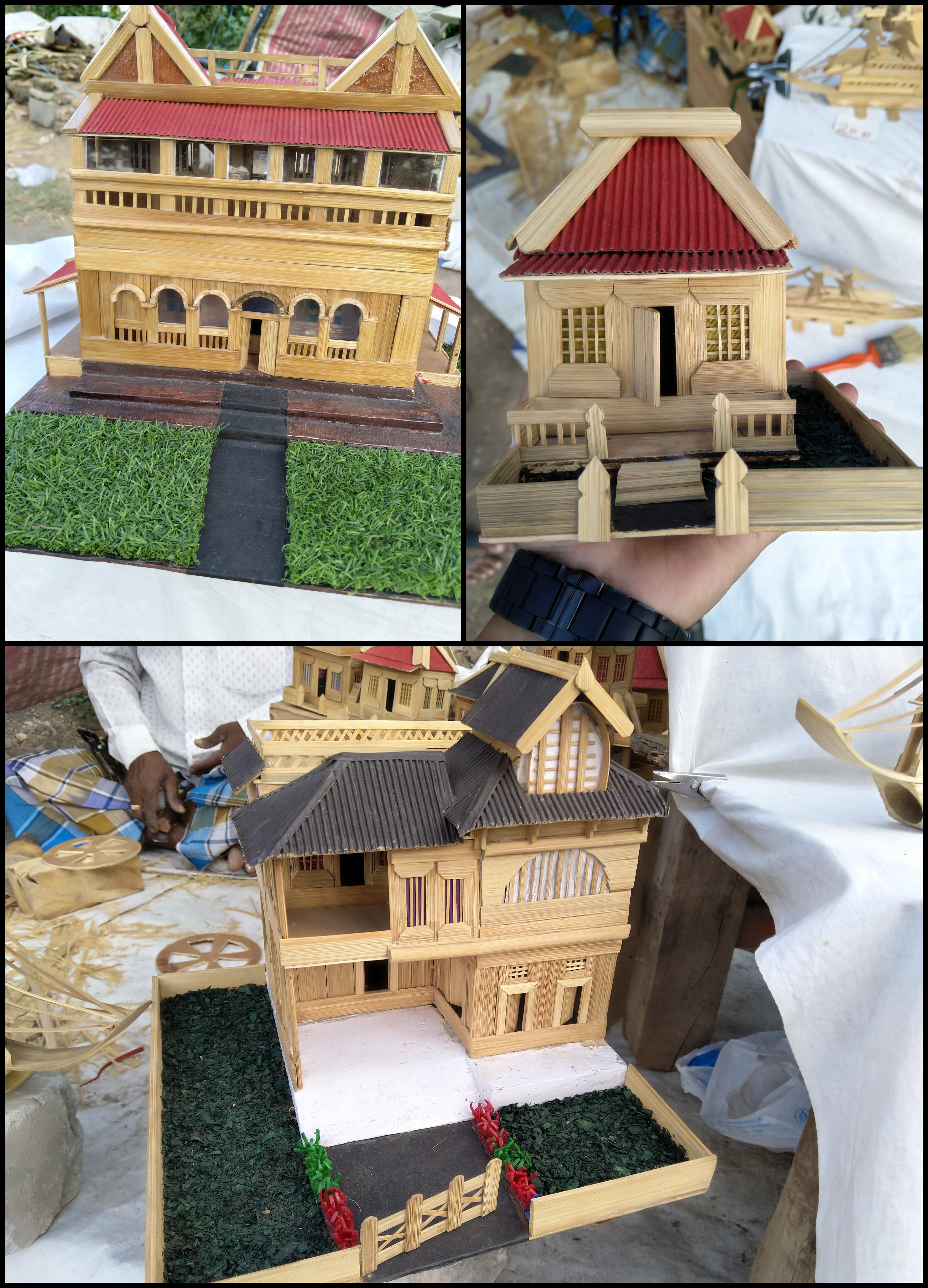 It is located opposite to Bhathrakaali Amman temple, sathy road. We witnessed exquisite bamboo craft works kept on a white linen cloth showcasing small houses and ships. On the left, we saw a man with rugged clothes and worn hat like Indiana Jones creating another work for the showcase. He greeted us with a smile on his face. The shop is positioned near the road, with a very messy workspace, not comfortable for crafting, also he sits on a plastic sheet. On the whole, it gives no vibe for creative thoughts. We didn’t say a word; we were awestruck by the perfection of crafts he created and the effort he did to make it look beautiful. The wooden shining houses were welcoming us to stay inside, the ships took us for a voyage to the medieval period and the temple gave us a divine feeling. We were delighted when the man said to us to take the craft by hand and asked us to touch and feel it, also it was written on a poster near the shop. We took it in our hands and felt the smooth finish and glossy look of the wood. Enchanted by the impression, we took every piece of crafts and started observing the finish of work. It was flawless, every cut, attachment and additional grass and roofs for house reaps a perfect finish. The man also requested us to take pictures of it and share with friends. He never bothered us in purchasing the craftwork also he was very silent concentrating on building a new ship.