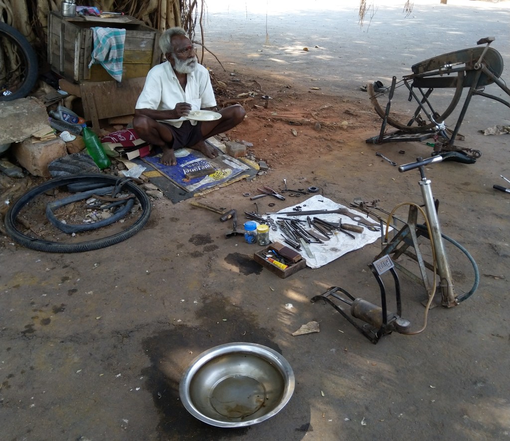 There’ll be a big old banyan tree in the location. Under that tree, this wise old man sat repairing cycles. He has pumps and tools on a small sheet spread on road. He is nearly 80 years old but has the strength of the Thor. He calls me ‘kannu’(dear) whenever I come for a repair and he asks for my well-being, and I used to call him ‘thathaa’(grandpa). Every time I give my cycle for service, he repairs it with perfection and also does some extra repairs which I haven’t told him to do. He knows what is the problem with the cycle when I pedal to that shop, damn he is such a three-eyed raven. There are many cycle shops in the surrounding but I prefer him because I trust this person and I feel safe giving my cycle even though he doesn’t have an attractive building for mechanic works.