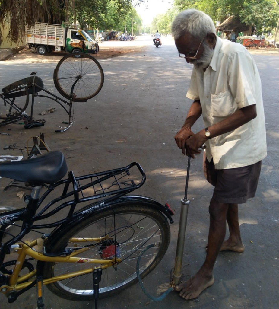 He said he is repairing cycles for more than 50 years. His family members are working as a coolie (daily wagers). Yet he doesn’t ask extra money for the hard work. I remember the maximum money I gave to this man was Rs.70. However, he stays strong physically as well as mentally. He always looks sane and makes his job as a priority instead of chit chatting. He may not be a warrior like Hercules or Atlas, but a hardworking captain wheels thathaa who do the extra to justify his passion for the work and gains the respect of people.