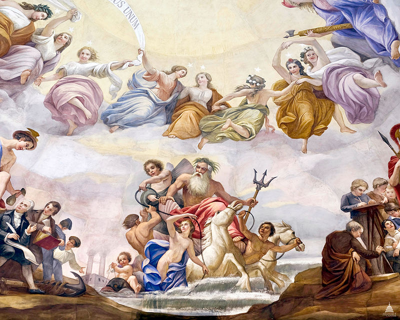 The Apotheosis of Washington altogether shows the Roman republic as a precursor to American democracy. G.W presiding over the values in the mid-century defined the hopes for the nation. That’s why he is at the center among the Gods.