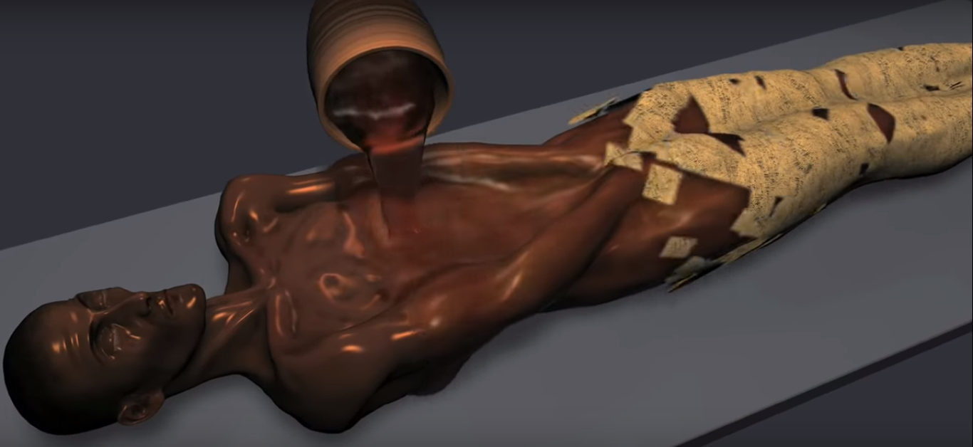 1. The dead person is kept naked on a raised surface and operated. Living cells can rebuild itself after damage made by certain enzymes. But after death, this revival of cells is not possible and thus the body decays. So, the embalmers remove internal organs (stomach, intestine, liver, lungs etc., which has bacteria which results in quick decay) except heart as it is considered holy and the judgement resides how pure heart is.