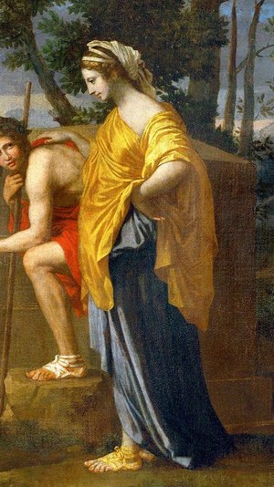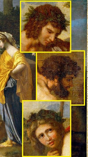 Kneeling Shepherd: He is the only person who is keenly observing and trying to make out the inscription. He moves his fingers over the engraving written on the tomb. Also, this person is different from others as he doesn’t have any leave crown and other shepherds don’t wear any sandals as he does. He wears a blue robe with blue strap sandal and also matches the colour with the woman. Do they have any relationship?