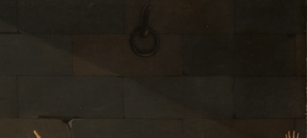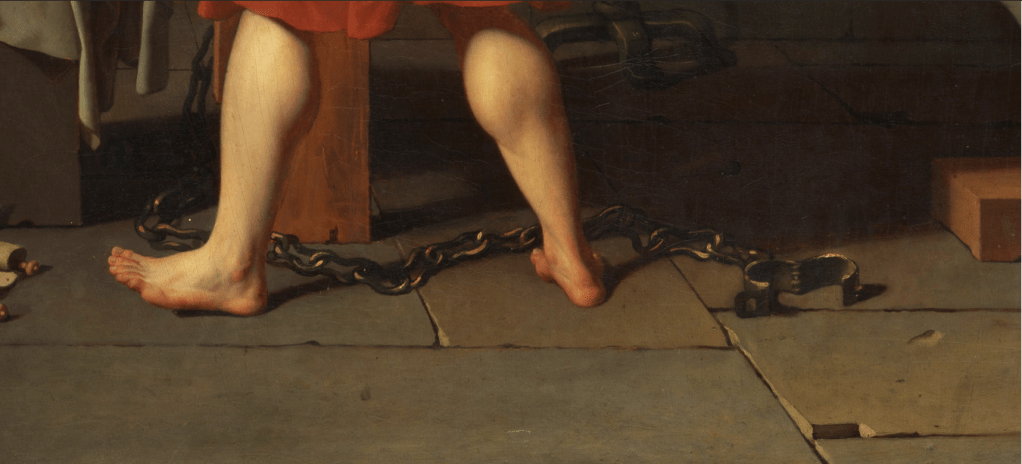 The prison throws up a dull outlook with a bare grey stone wall and top roof windows in the room behind. The prison is old as we can see the missing pieces from the broken walls and floor. The light stand has a burning thread that is fading away, does it remorse for the death? There can be metal chain holder seen on the walls which might be used to chain up Socrates and there can also be shackles seen below the bed. This is a symbolic illustration set by David to imply that Socrates is freed from the ideology of Government and its society.