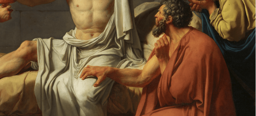 The painting has been talked over as a poor representation of the historical event. Starting with Plato not being in the actual scene and he wasn’t actually old as depicted in the painting. Also Apollodorus, the man slating against the wall was not there in this scene as he was sent out by Socrates since he was highly emotional.