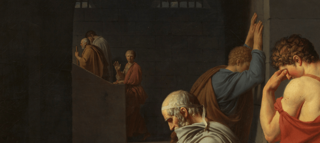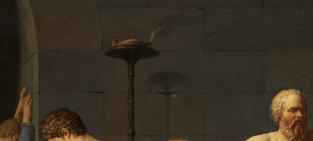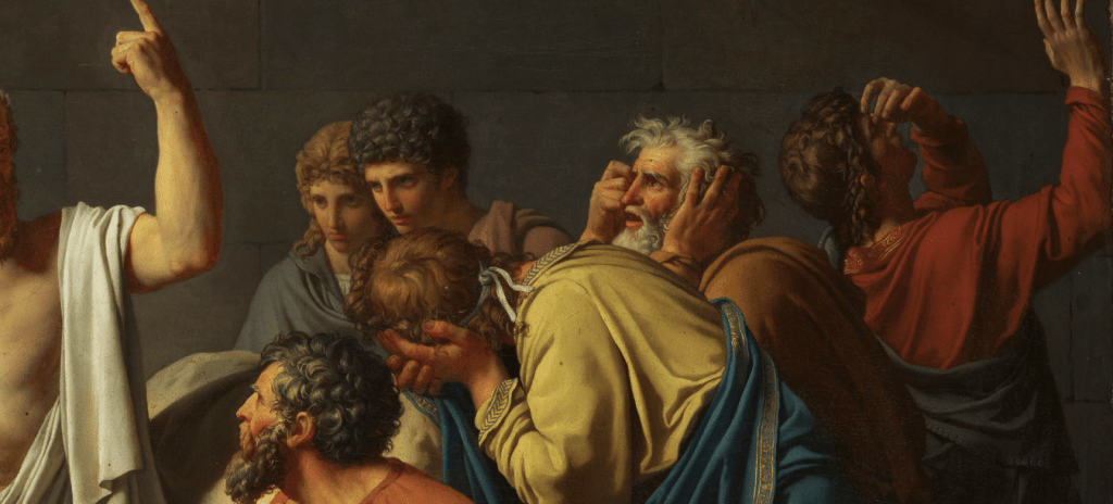 The scene depicted in the painting happens inside the prison with Socrates being the centre of the masterpiece. There is tension in the minds of people surrounding Socrates. The contrast can be seen in the face of Socrates. Plato wrote this play in his dialogue on the soul, the Phaedo.