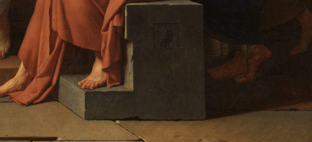 There were two signatures of Louis David, one below Plato which are initials. The place where the memory projects into painting and the other signature can be seen with the name “L.David” below Crito. The artist sees himself as Crito in this painting who doesn’t want to let Socrates leave his friend. The way Socrates portrayed in this painting is quite muscular. But in reality, he was old and not so toned