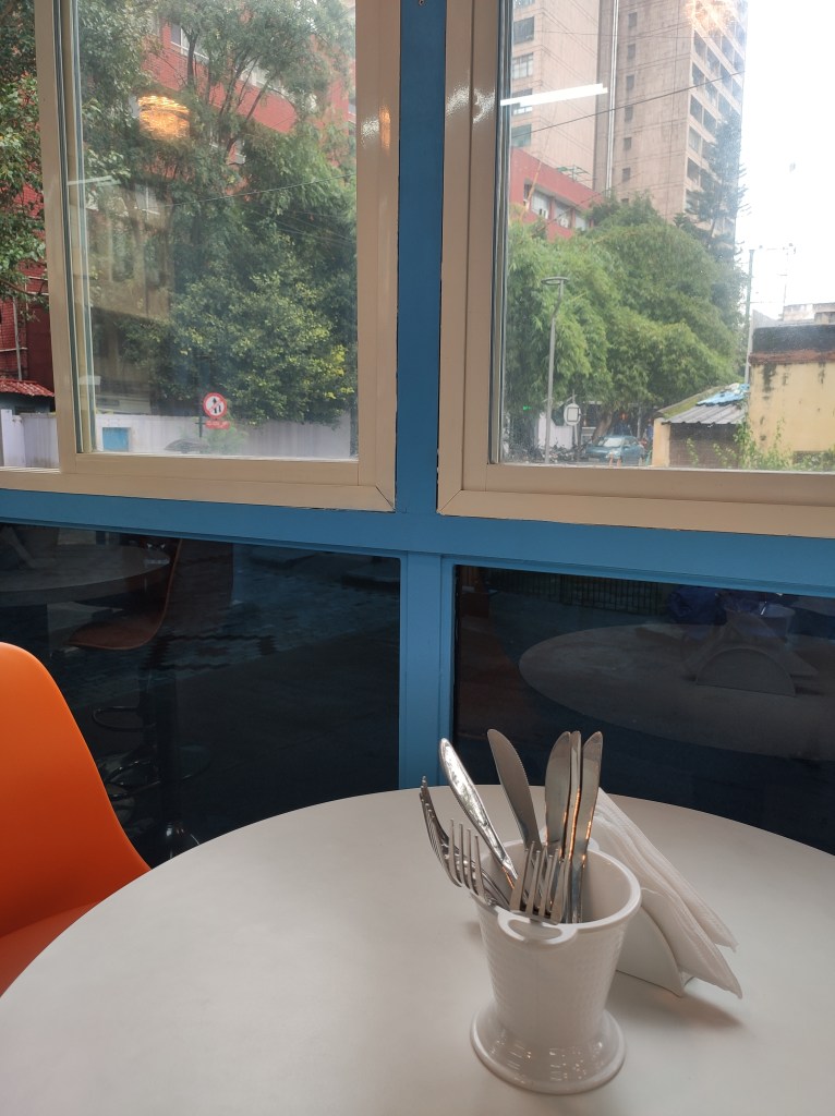 Out of the blue, my stomach started grumbling, looks like it requires some delicious guests. I was looking around to find a place that can satisfy my hunger as well as provide a rich dining experience. The sky was still grey, but I found its vibrant colour sucked into a building. I was invited with blood-red roses and blush pink flowers. The place has a board which says ‘Blini Bistro’. It was around 3.00 pm and no one was there, just a blissful 80’s pop music and orange chairs. I sat across the chair facing the window cherishing the drop of rain that slides over the glass pane. I pulled out my novel from my bag and started reading.